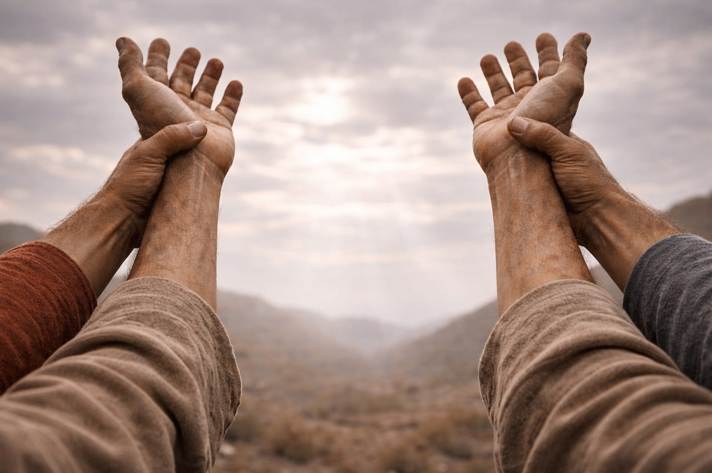 This image has always struck me. Moses’s hands grow heavy, and he needs others to hold them up. The word used is emunah: his hands remained steady until sunset.